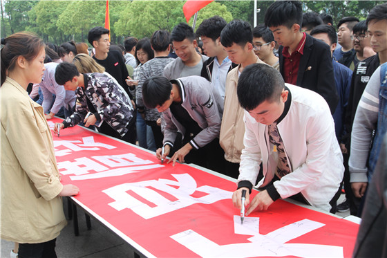4月26日下午,学校在东区综合楼前广场举行“拒绝不良贷款倡导理性消费”大型签名活动。学校副校长杨立明、学工部(处)负责人沈建林、保卫处负责人罗唯、学工部(处)全体工作人员及各教学院1000多名学生代表参加了此次活动。学生代表美容学院王嘉怡同学宣读了“自觉抵制不良贷款”倡议书。