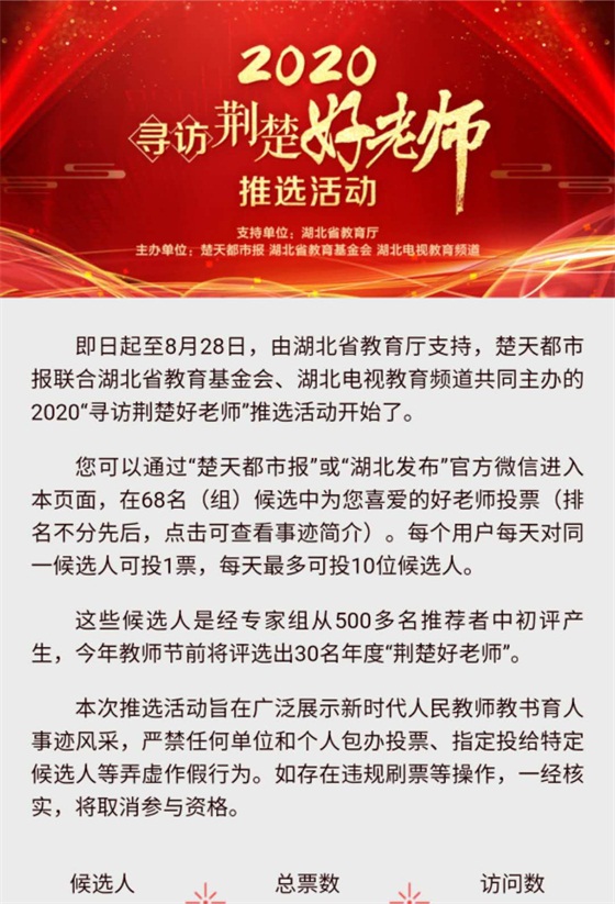 大家可以通过“楚天都市报”或“湖北发布”官方微信进入本页面,点击可查看事迹简介、投票,每个用户每天对同一候选人可投1票,每天最多可投10位候选人。
