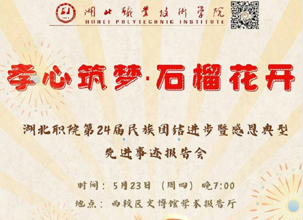 (本网讯 黄璐 唐熙隆)5月23日晚,“孝心筑梦·石榴花开”——第24届民族团结进步暨感恩典型先进事迹报告会在西校区文博馆报告厅隆重举行。12位民族团结进步模范个人、感恩先进个人分享了孝老爱亲、民族团结、创新创业、志愿服务、文化传承、乡村振兴、技能成才、产业报国的先进事迹,展示了“强校有我”“创高升本”的最强拼搏气场,彰显了“民族团结”“达济天下”的深厚家国情怀。相关职能部门负责人、各教学院学管副院长、团总支书记及学生代表等聆听了报告会。