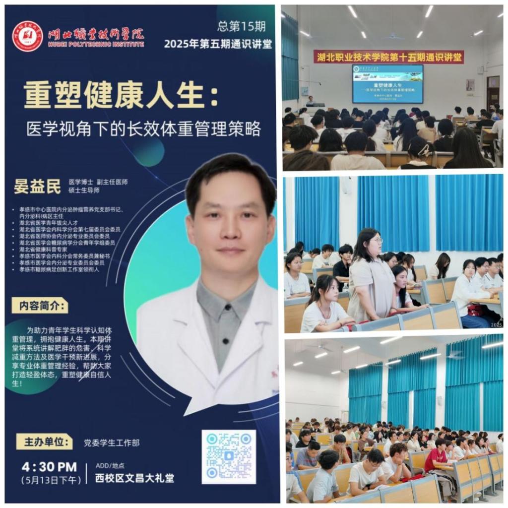 (本网讯 祝非凡)5月13日,学校第15期通识讲堂在南区知行楼阶梯教室开讲,本次讲座以“重塑健康人生——医学视角下的长效体重管理策略”为主题,特邀孝感市中心医院内分泌肿瘤营养党支部书记、内分泌科主任晏益民主讲,旨在帮助师生科学认知体重管理,拥抱健康人生。