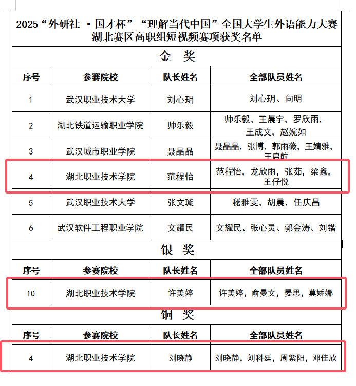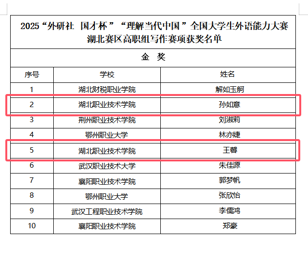 我校在写作、短视频赛项中共斩获3金1银1铜。护理学院孙如意、教育与艺术学院王馨荣获写作赛项金奖,其中,孙如意以省赛第二名的优异成绩成功晋级国赛。短视频赛项中,医学院范程怡团队荣获金奖,口腔医学院许美婷团队、刘晓静团队分别摘得银、铜奖。至此,2025全国大学生外语能力大赛(湖北赛区)所有赛项全部结束,加上此前在演讲赛项获得的1金1银,我校选派的所有选手(团队)均荣获省级奖项(4金2银1铜)。