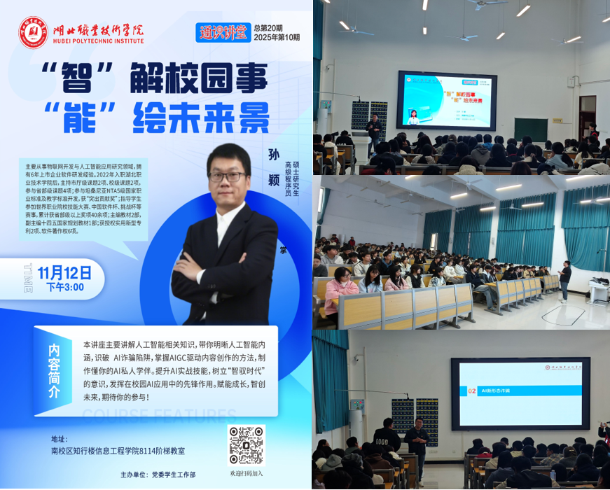 11月12日,第20期通识讲堂在南校区知行楼8114阶梯教室开讲。高级程序员、信息工程学院孙颖老师以《“智”解校园事,“能”绘未来景》为主题,为两百余名学子带来一场关于AI应用与创新的深度分享。
