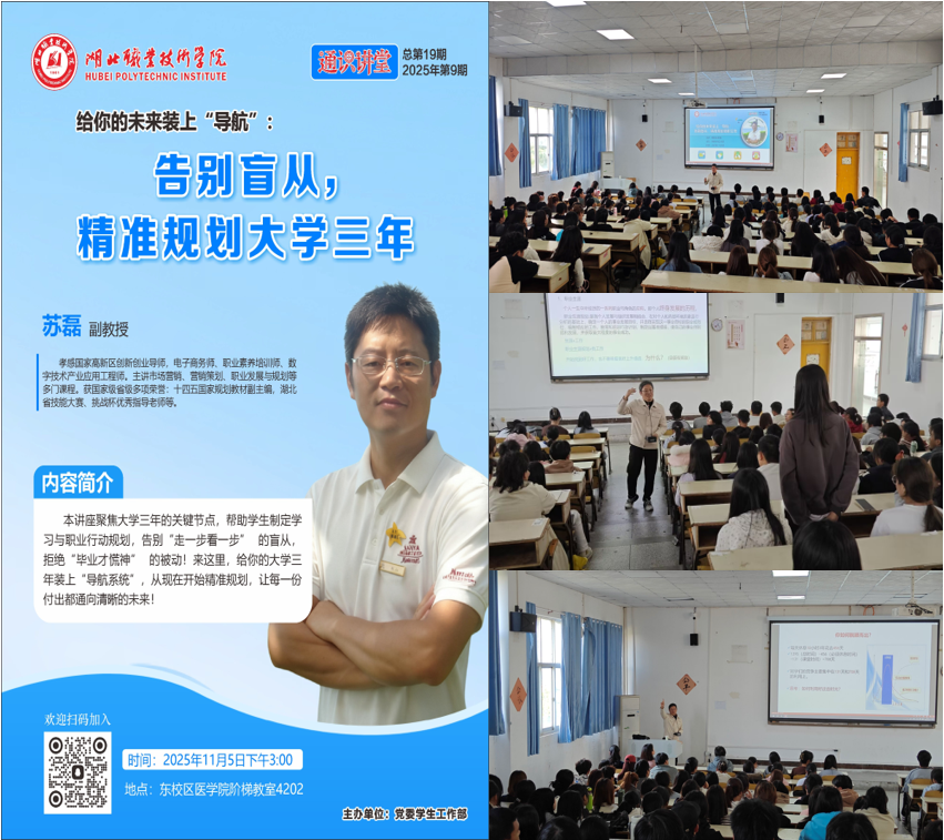 11月5日,第19期通识讲堂在东校区开讲。孝感国家高新区创新创业导师、财经与旅游学院副教授苏磊老师以《为未来装上“导航”:告别盲从,精准规划大学三年》为主题,为学子们科学规划学业与职业发展指点迷津。苏磊老师以“导航系统”为喻,紧扣高职学生学习特点与就业趋势,系统解析大学三年各阶段关键任务,勾勒清晰的“时间坐标轴”,并强调“规划不是一成不变的‘死计划’,应如导航般根据路况灵活调整,其前提是目标明确。”其生动的阐释与实用的建议,为同学们摆脱“毕业即慌乱”的困境提供了有效方法。