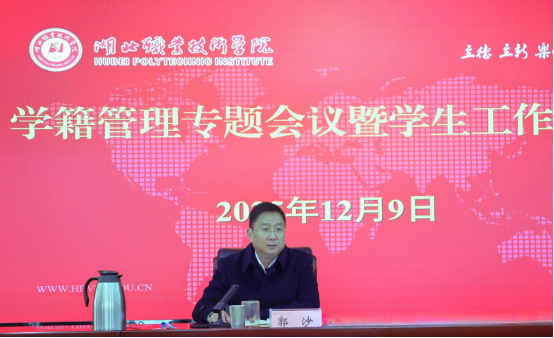 (本网讯 李婷天)12月9日上午,学籍管理专题会议在图新楼601会议室召开,校长郭沙出席会议并讲话,党委委员、副校长梅重主持会议。党委学生工作部、教务处、招生与就业创业指导处负责人及各二级学院院长、学生工作分管副院长和学籍管理员参加会议。