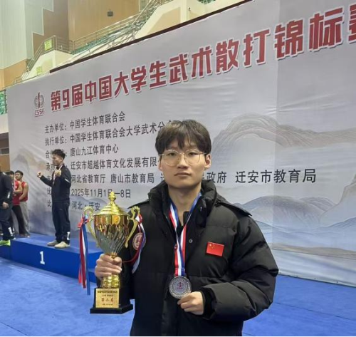 (本网讯王亚军)在2025年中国大学生武术散打锦标赛的赛场上,一位身形矫健的青年目光如炬。经过连番鏖战,他将一枚沉甸甸的全国银牌收入囊中,助力我校获得团体亚军,与来自全国的选手广泛交往、全面交流。他,就是我校财经与旅游学院2024级学生代鑫海。赛场上的锋芒,仅是他青春画卷中亮丽的一笔。在思想、学业、实践与文体多个赛道上,他以全速奔跑的姿态,书写着一份厚实而闪耀的青春答卷。