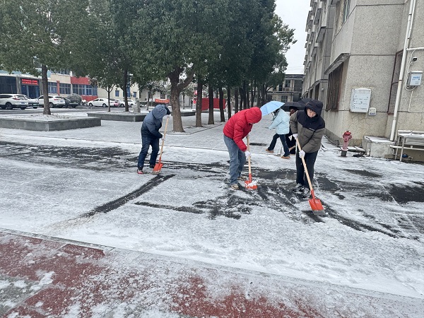 为应对此次雨雪恶劣天气,相关处室提前制定详细的应急预案,备足融雪剂、铁锹、扫帚等物资,优先保障师生高频活动区域的通行安全,同时对校园内的树木、路灯、排水设施等进行隐患排查,防止积雪压断树枝、结冰堵塞管道等情况发生,为快速响应、高效处置奠定了坚实基础。