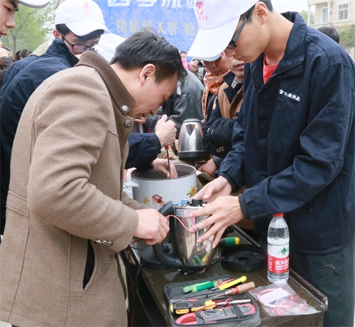 在家电维修服务台,也被需要维修的大小件家电围得水泄不通,来自汽车学院的师徒们凭着过硬的维修技术,热情的服务,赢得村民们纷纷点赞。同时,家电维修的队员们还在维修工作间隙为前来寻求帮助的村民们宣讲家电使用与维护小常识、用电安全知识等。
