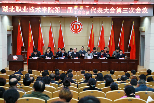 3月26日上午8:00,湖北职业技术学院第三届教职工暨工会会员代表大会第三次会议在庄严的氛围中拉开帷幕。出席此次大会的主席团成员在主席台前排就座,七个代表团的158名正式代表及17名列席代表满怀激情和嘱托参加了会议。学校党委书记蔡诗红致开幕词、校长朱虹作学校工作报告。开幕式由党委副书记张勇主持。