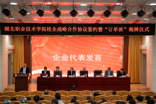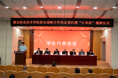 华强方特(孝感)文化科技有限公司企业代表万俊涛表达了企业对此次校企合作的满满诚意与务实规划。他表示,将把湖北职业技术学院作为“人才储备库”,把行业企业最新技术与实践经验融入教学,助力学生成长为契合企业发展需求的专业人才。订单班学生代表黄瑞轩在发言中表示:“非常感谢学校提供从校园走向企业的桥梁,这不仅让我们明确了未来就业方向,更能在学习中接触企业真实项目,为毕业后快速适应工作岗位打下坚实基础。”