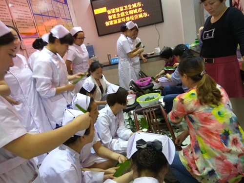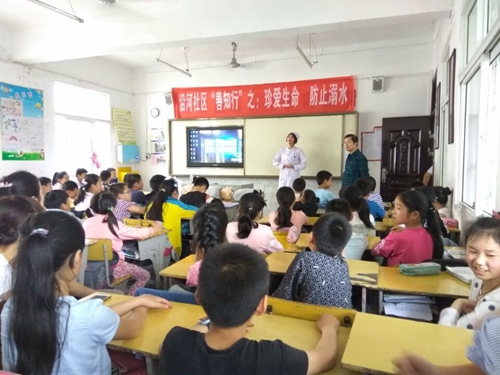 在沿河社区党员群众服务中心,志愿者们一边宣传普及老年护理知识,一边和社区阿姨们一起包粽子,现场气氛和谐融洽。下午15:00左右,志愿者们前往沿河小学,在五年级二班教室开展小学生防溺水安全讲座,志愿服务队队员丁雯妮结合自身实例、通过ppt演示,从游泳安全要点、如何预防游泳时下肢抽筋、游泳前的暖身运动要领、游泳溺水自救方略等方面进行讲述,强调了防溺水“六不”和“四个牢记”的基本知识。在急救护理专业教师周剑忠的指导下,队员们还现场演示了“徒手心肺复苏”的整个流程,现场的小学师生们深受教益。